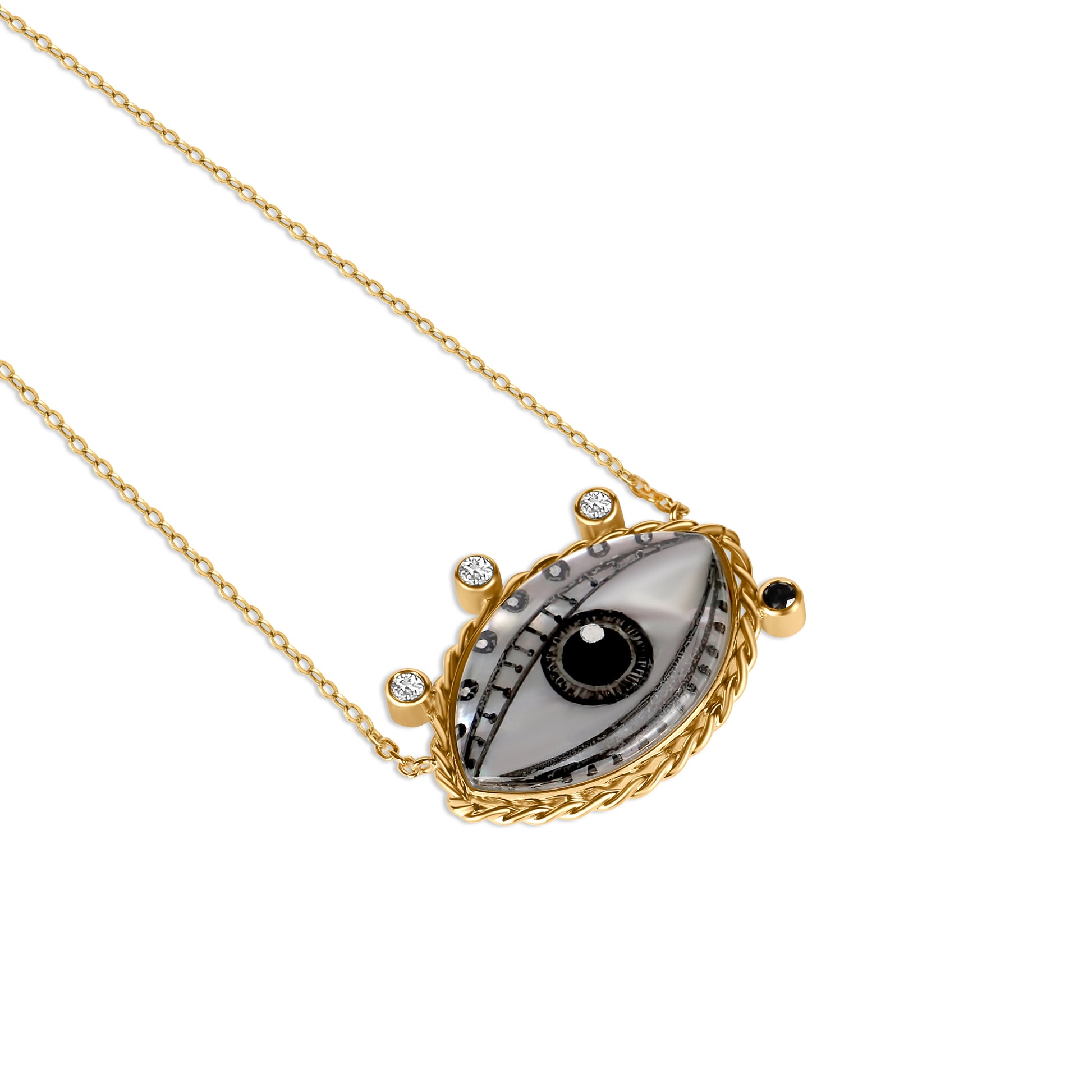 18k gold necklace with a 16x24mm Marquise eye, 3 white diamonds, and a single black diamond framed with gold.