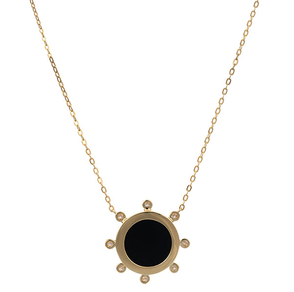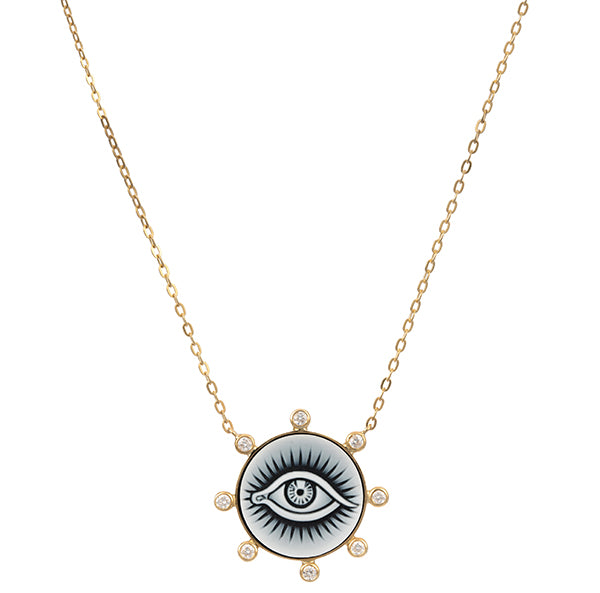 18k gold necklace with an engraved cameo eye on black agate with 8 diamonds all around.