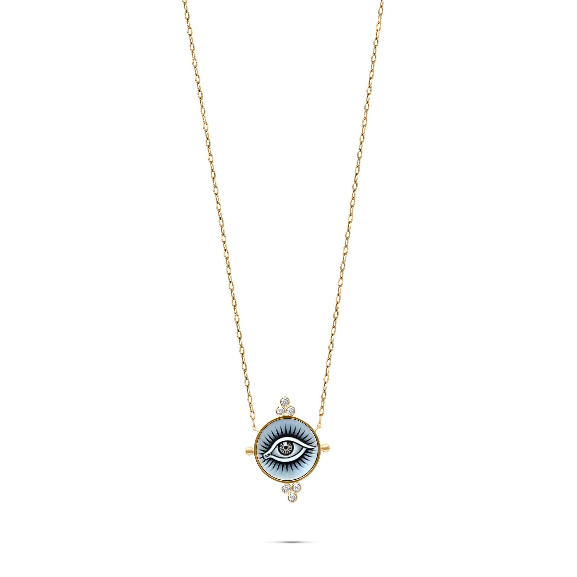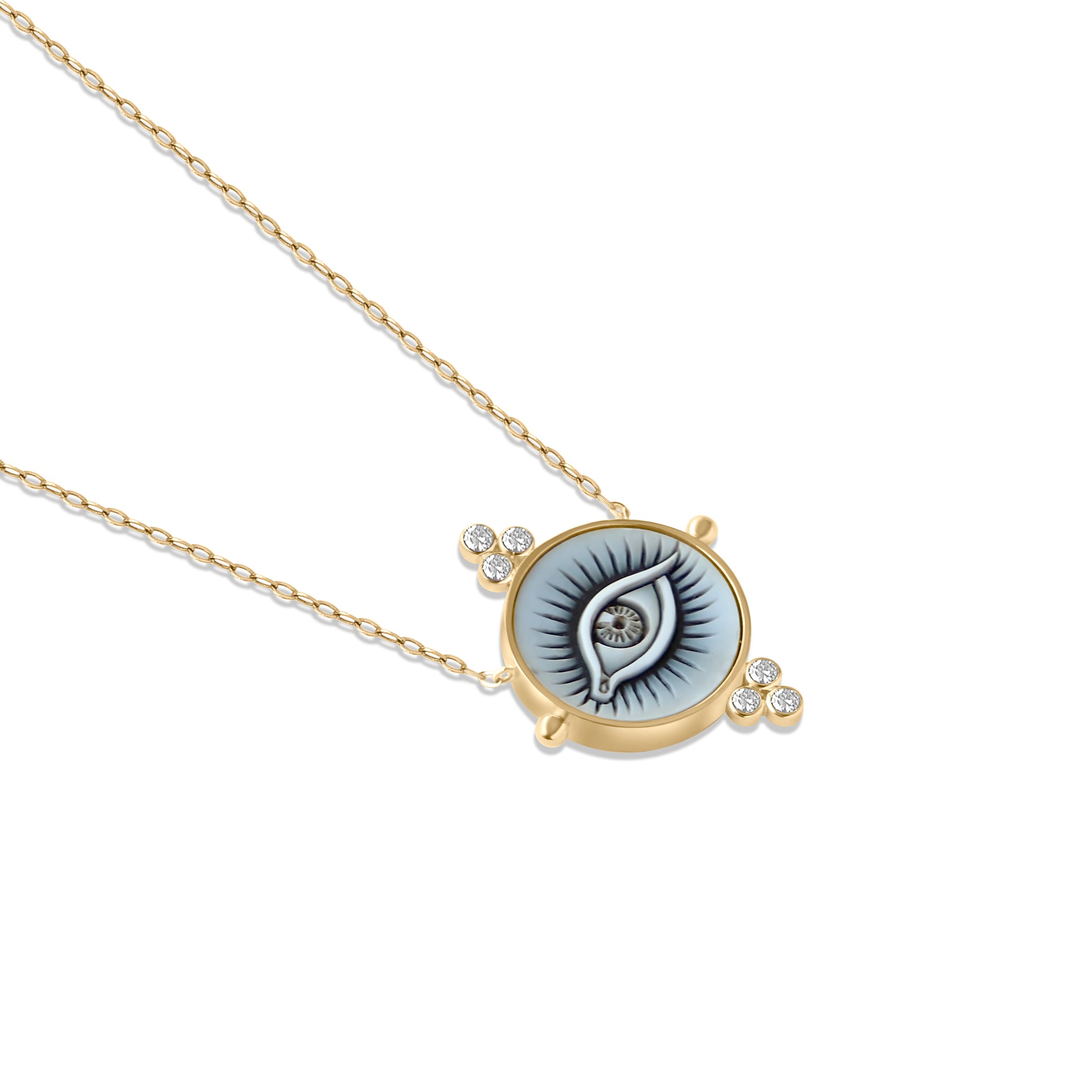 18k gold necklace with an engraved cameo eye on black agate with 6 white diamonds.