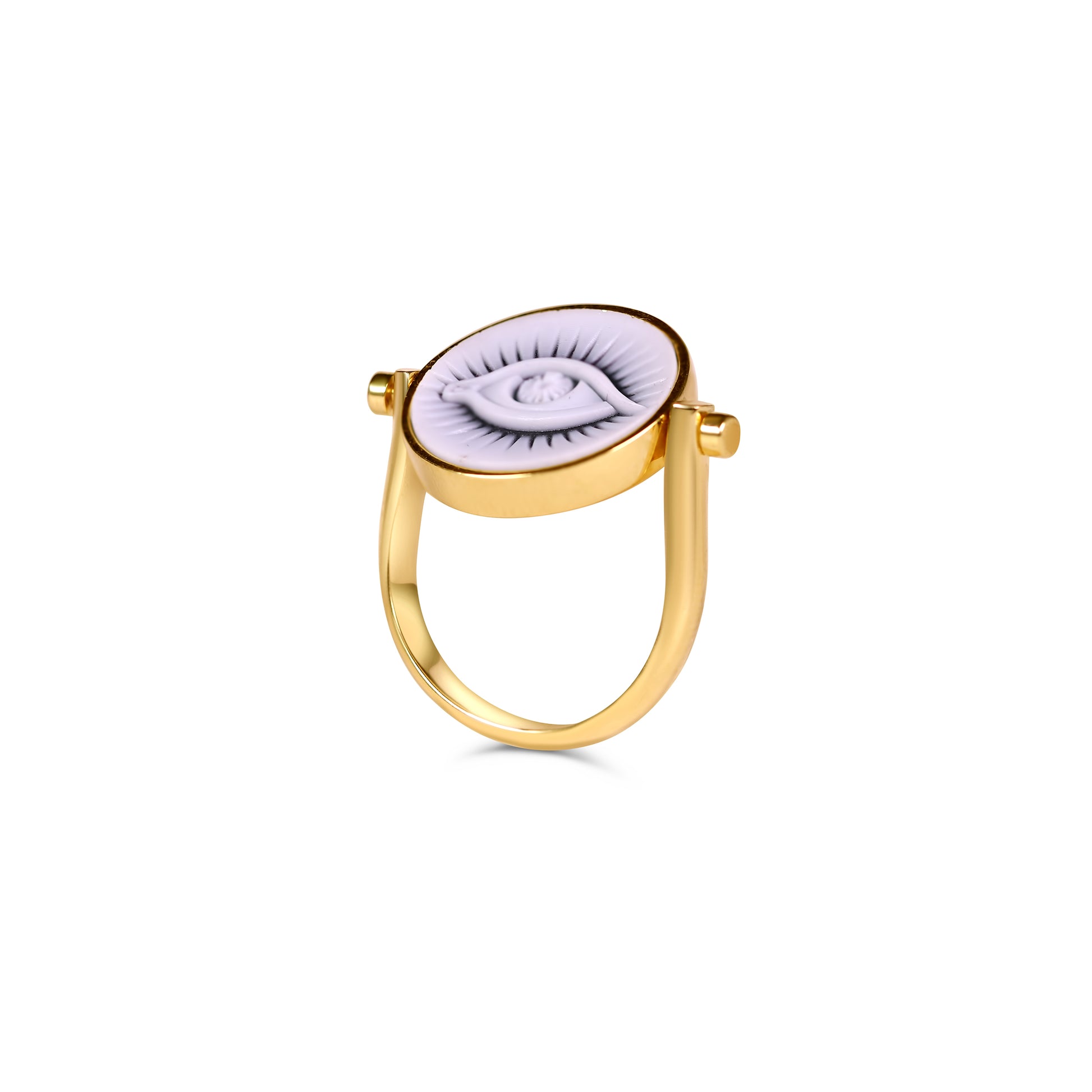 18k reversible gold ring with 15mm cameo eyes on black agate and a gold Smiley on the other side.