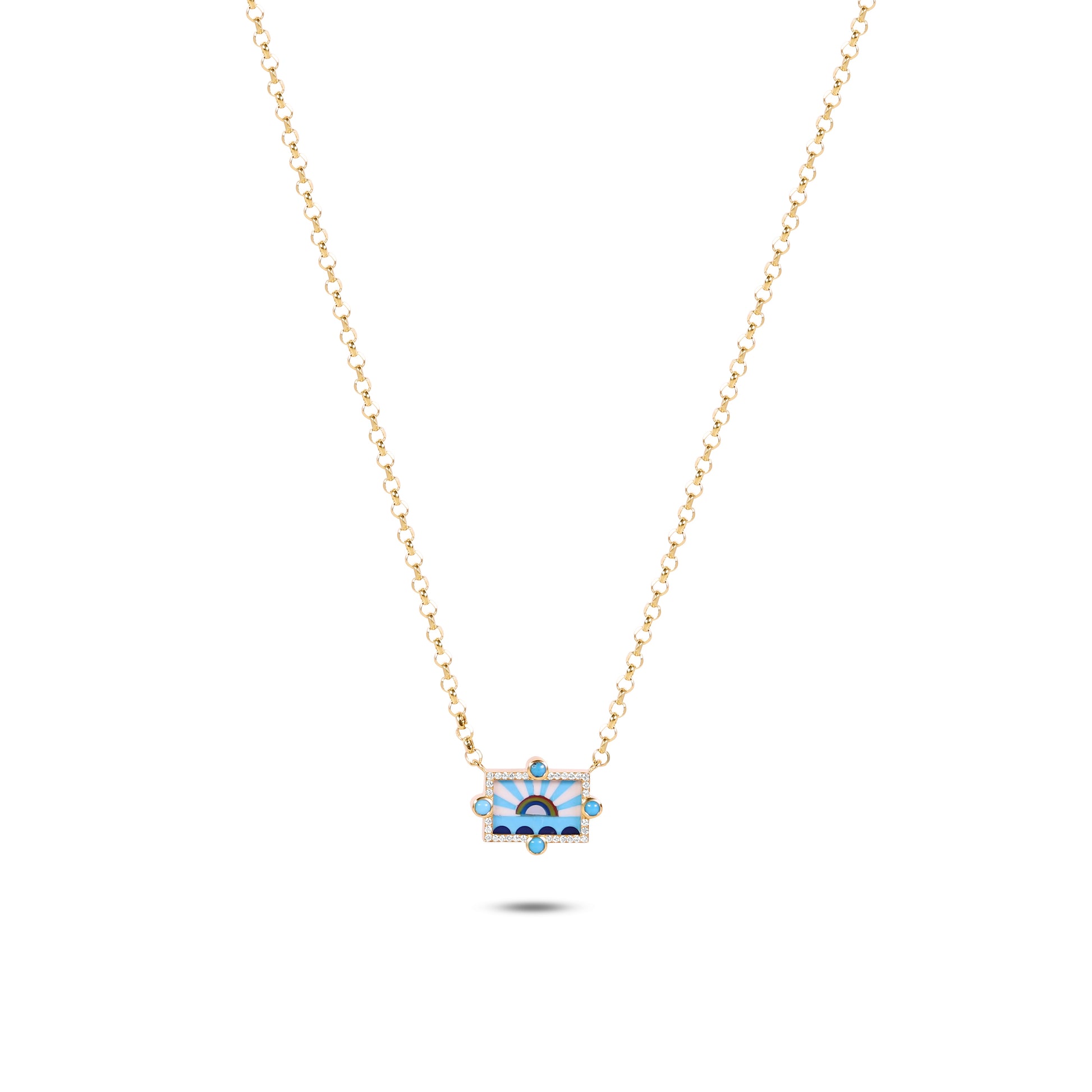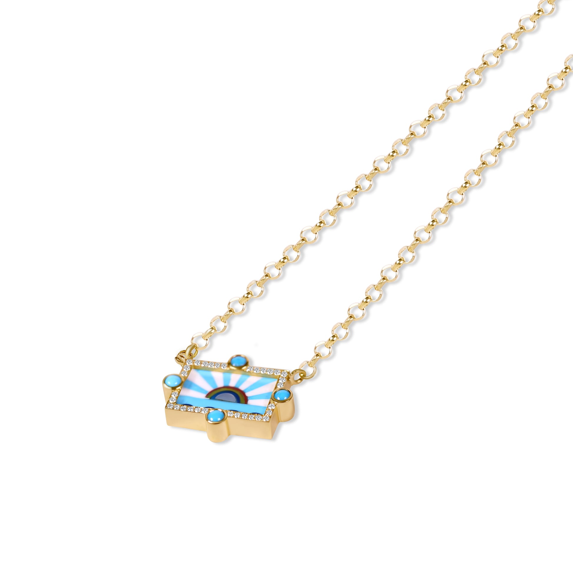 18k gold necklace with Howlite, Shell, and colored glue Rainbow surrounded by a diamond frame and 4 turquoise stones.