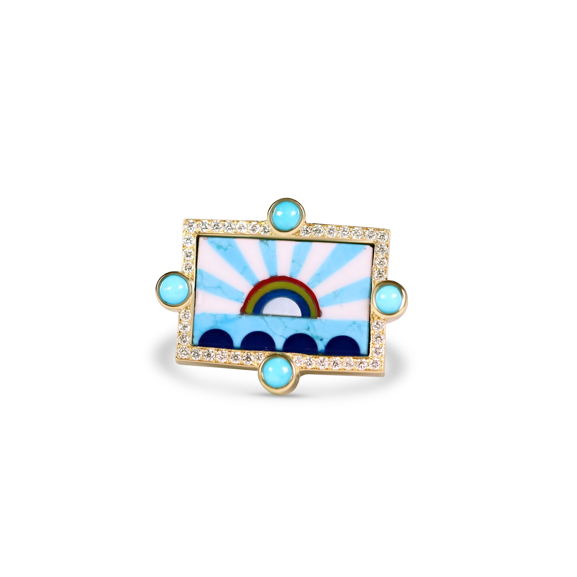 18k gold ring with Howlite, Shell, and colored glue Rainbow surrounded by a diamond frame and four turquoise stones