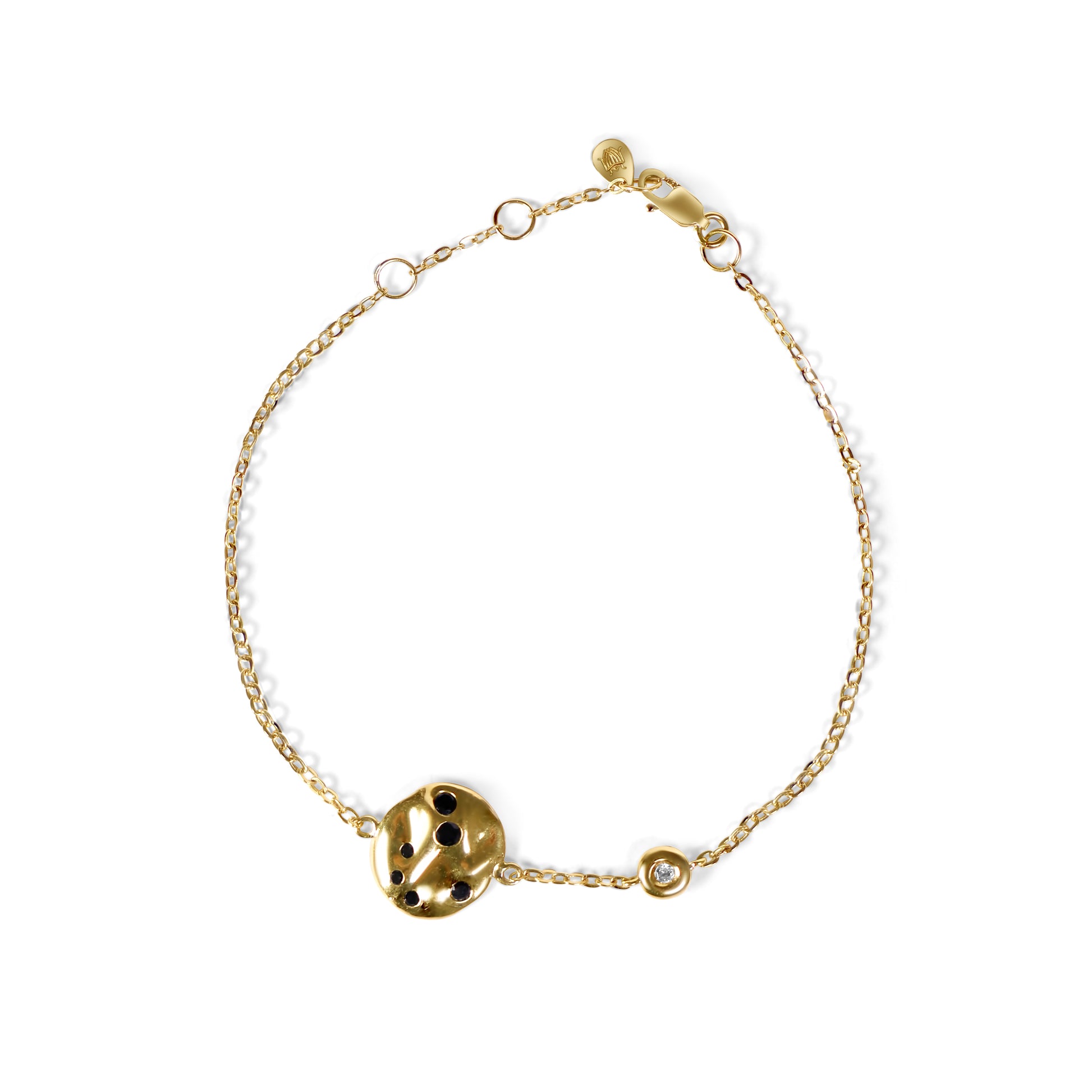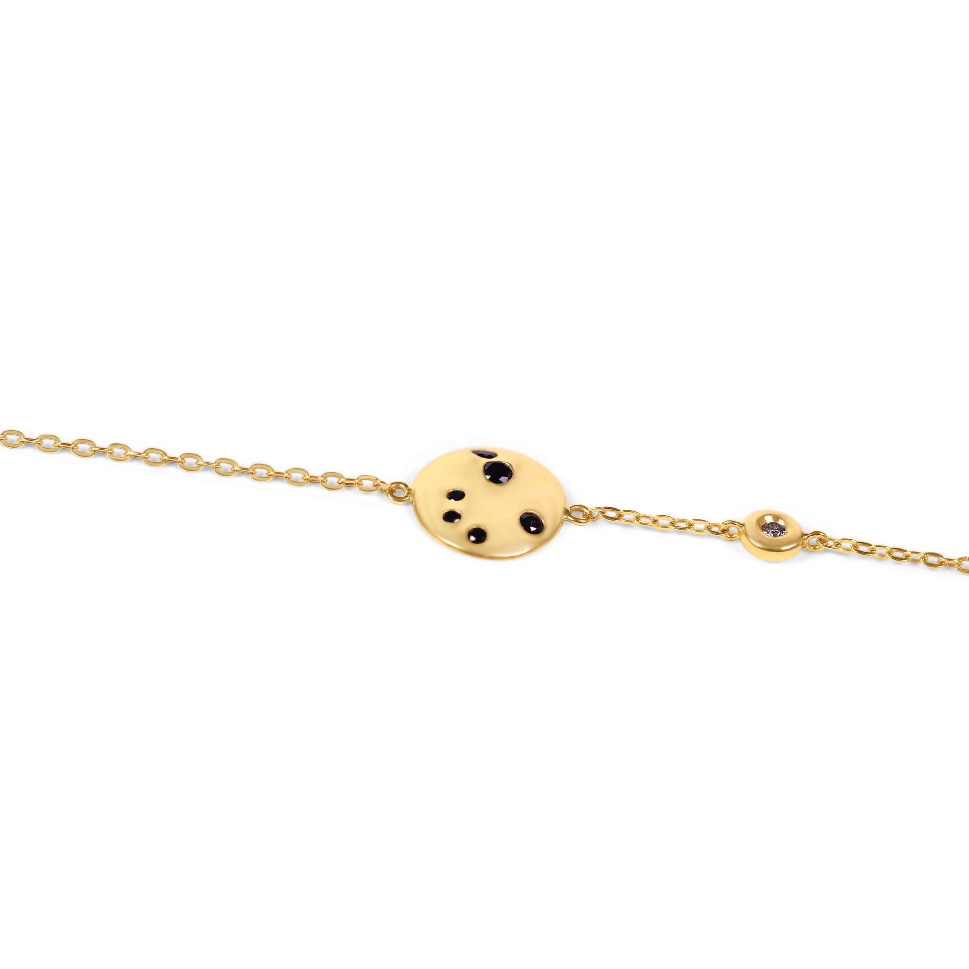 18k gold bracelet with small gold cookie, black diamonds, and a single white diamond on the chain.