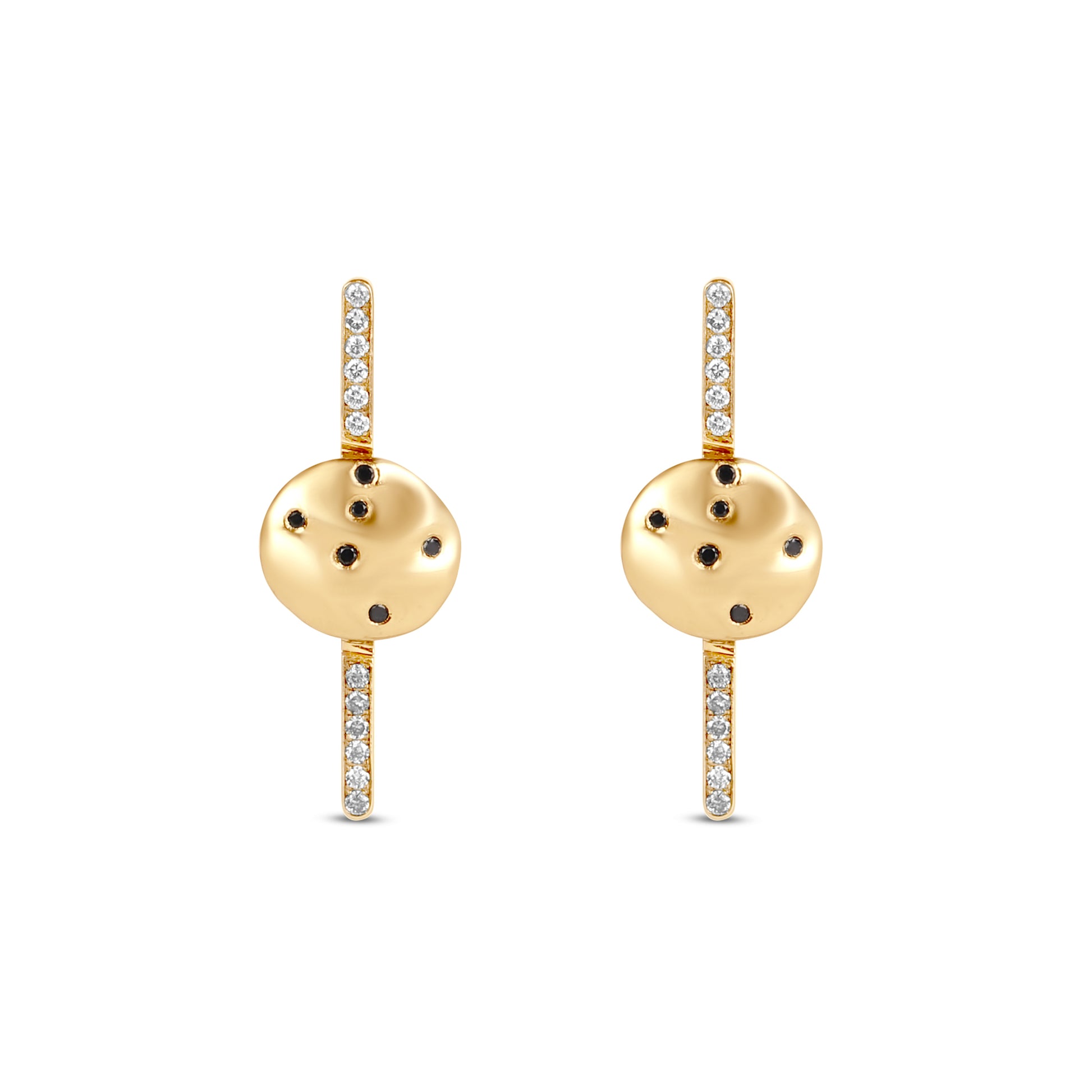 18k gold stud earrings of small gold cookies, black diamonds, and diamond sticks.