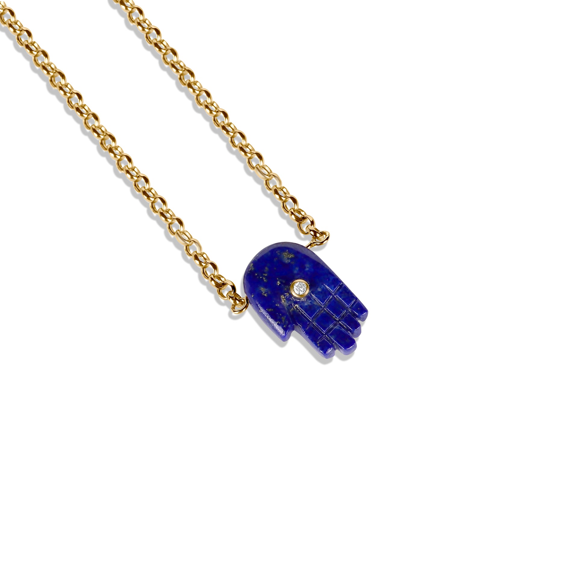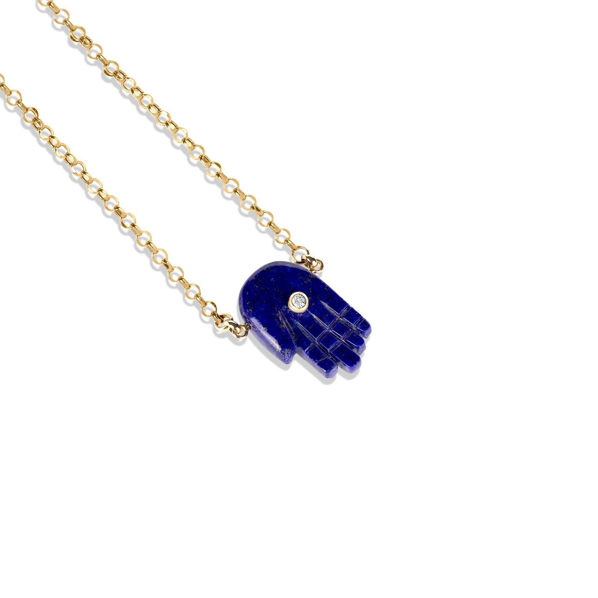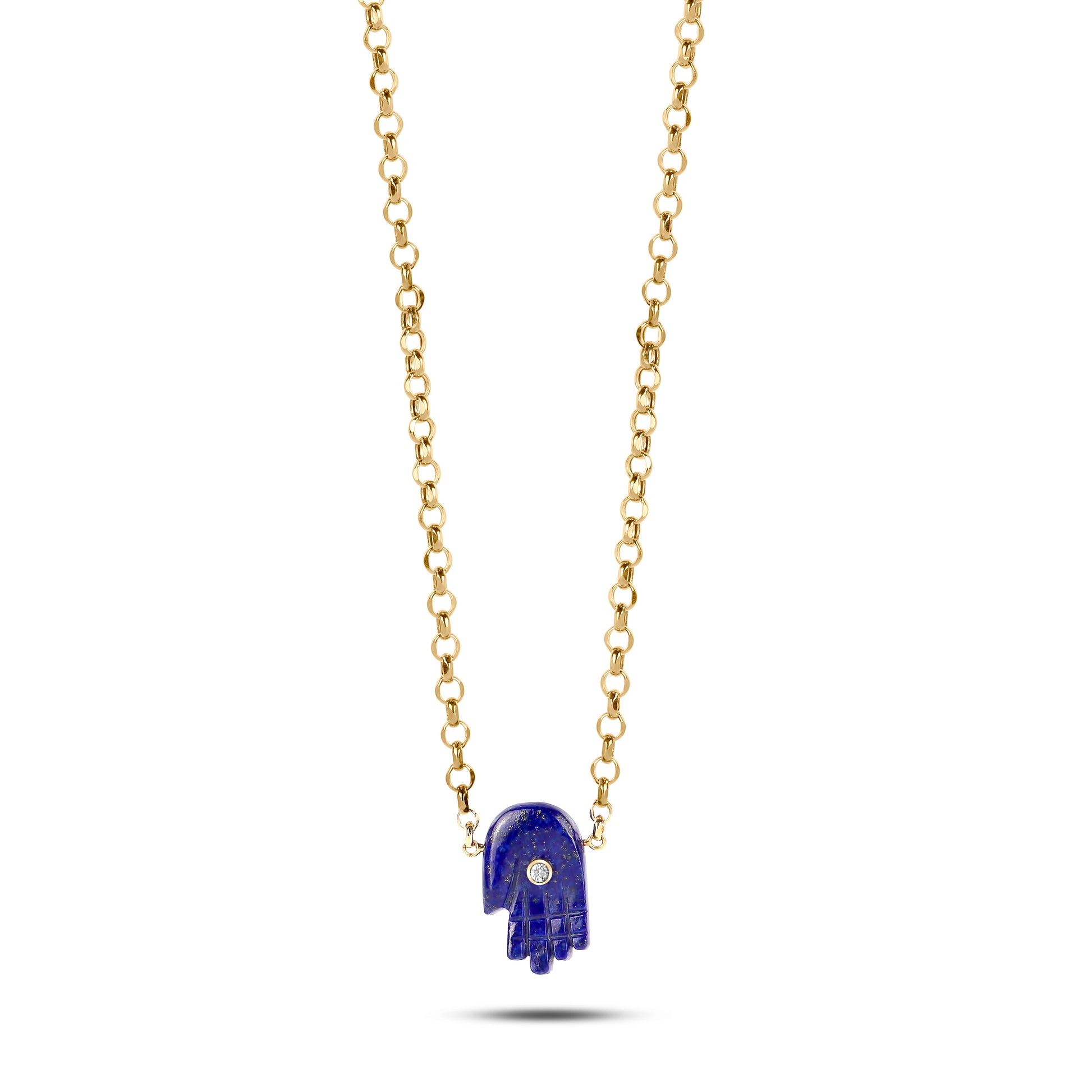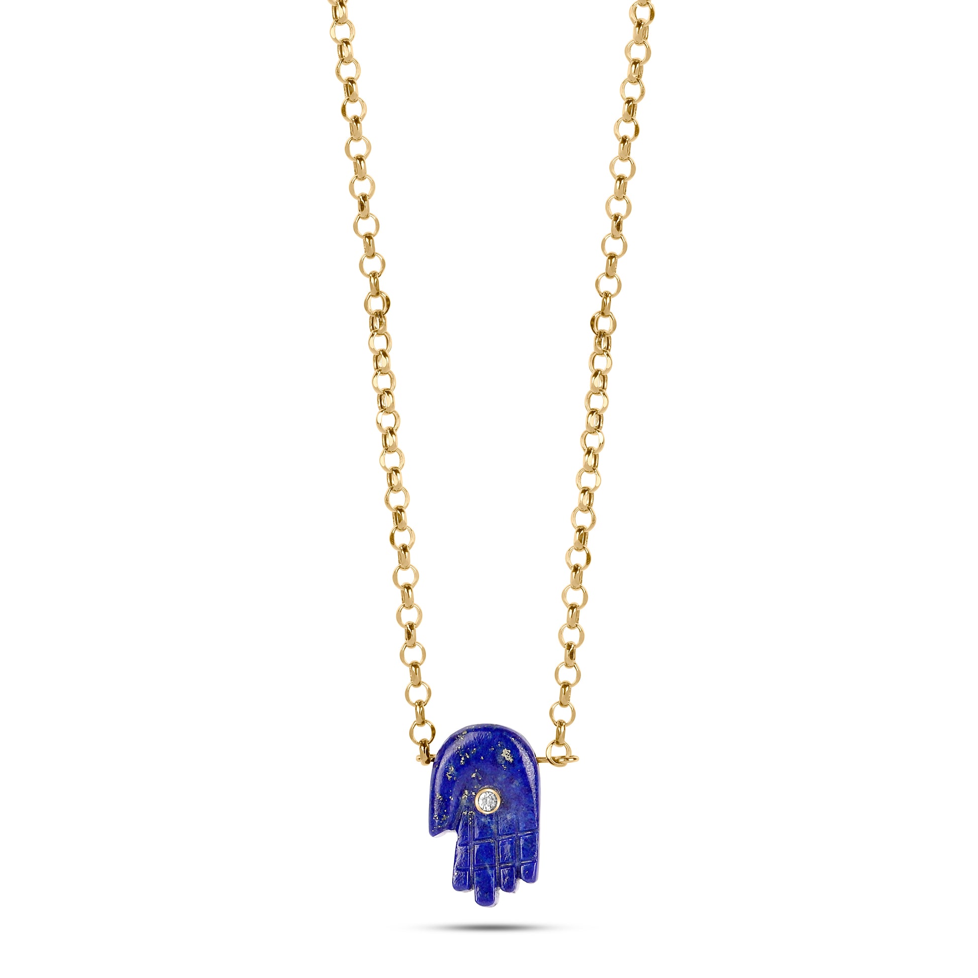 18k gold necklace with a 10cts palm-shaped semi-precious stone and a single white diamond in the center.