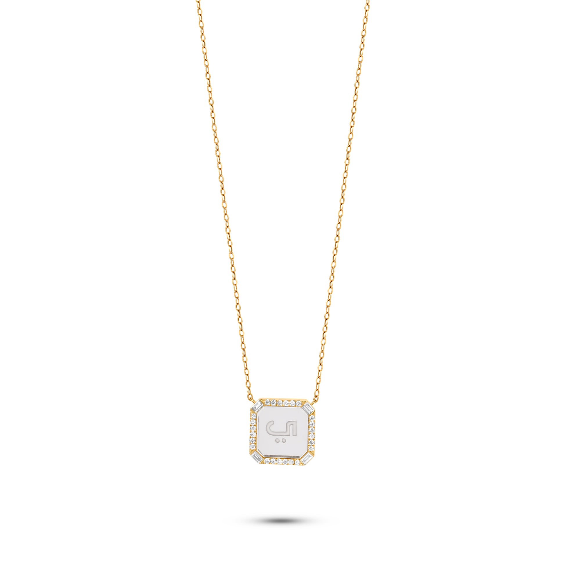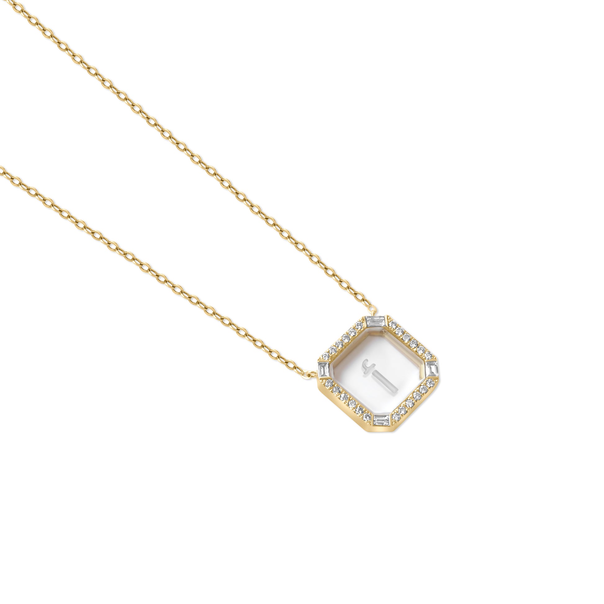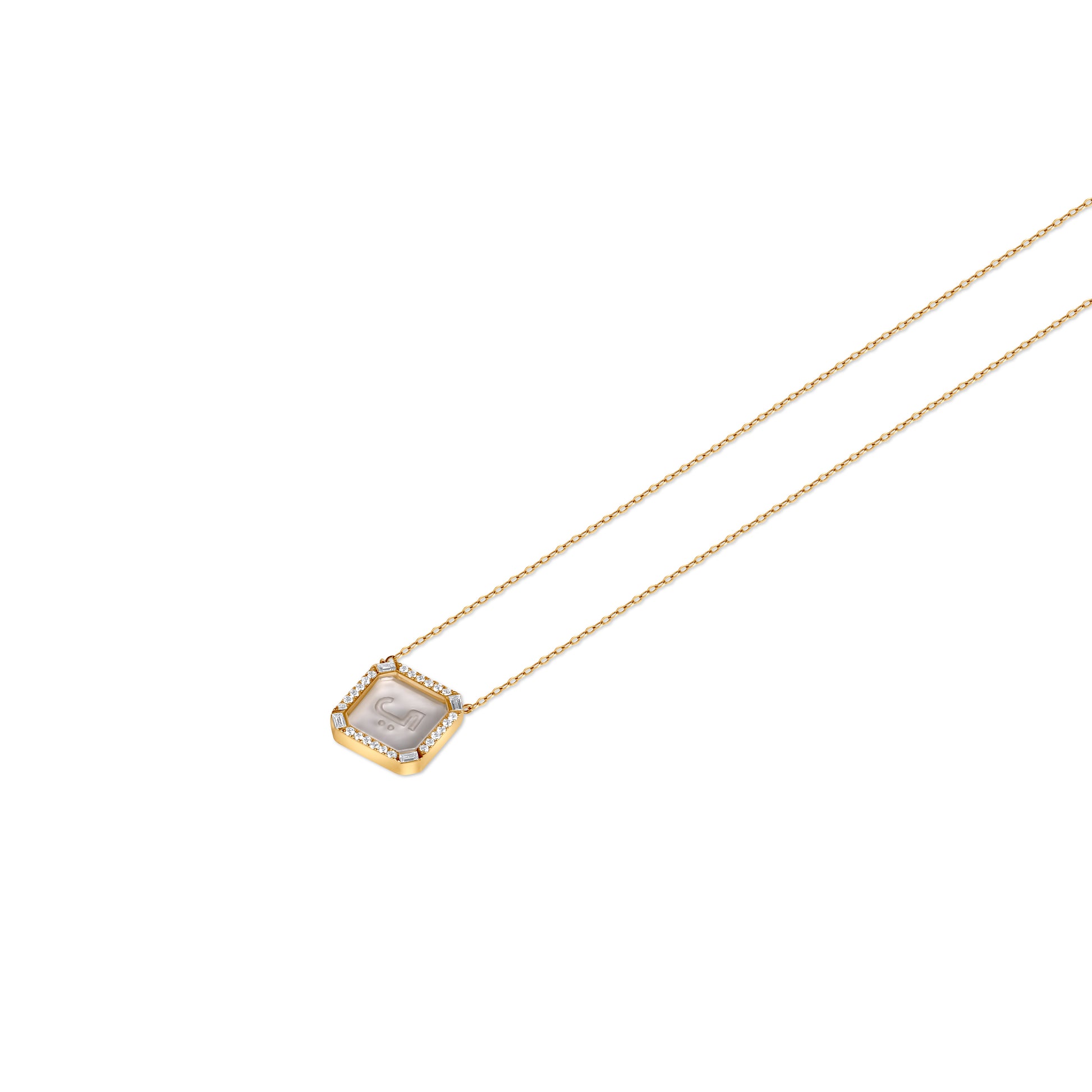 With an Arabic letter engraved upon the crystal quartz, Engraved Letter necklace is a 18k gold necklace rounded with decorative diamond details that empowers the self or symbolizes the beautiful bond of a loved one.