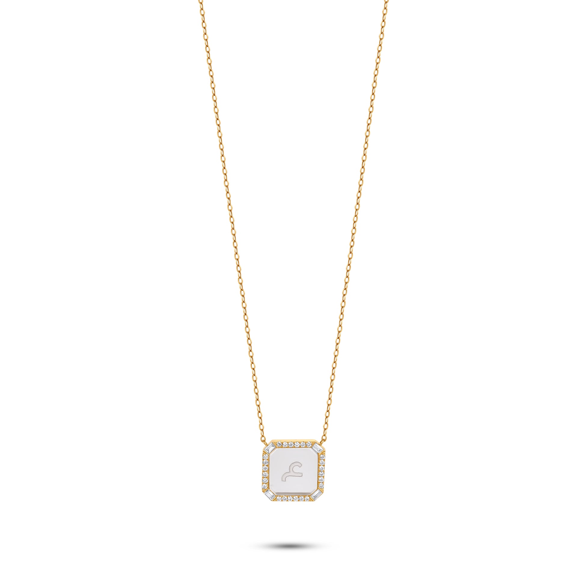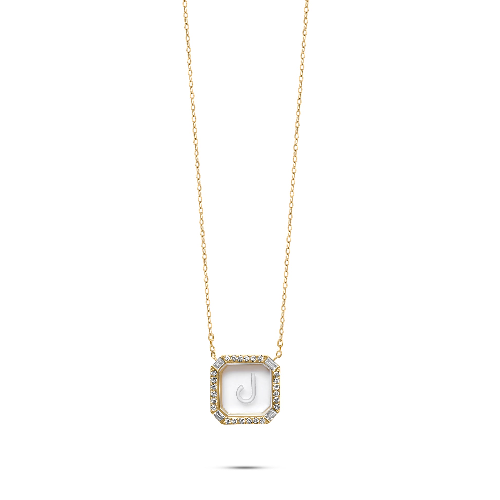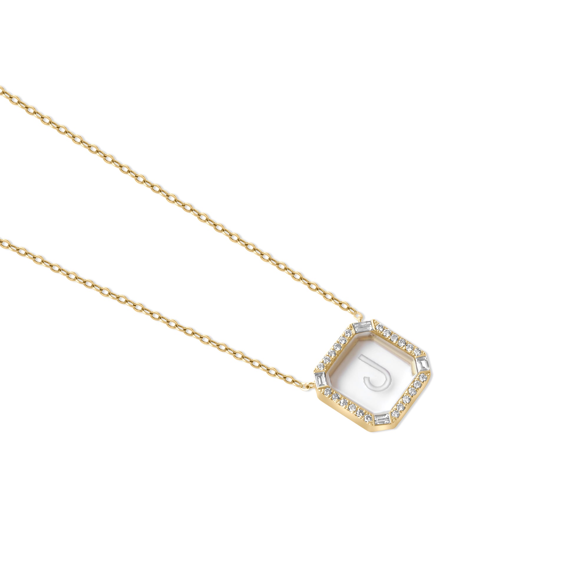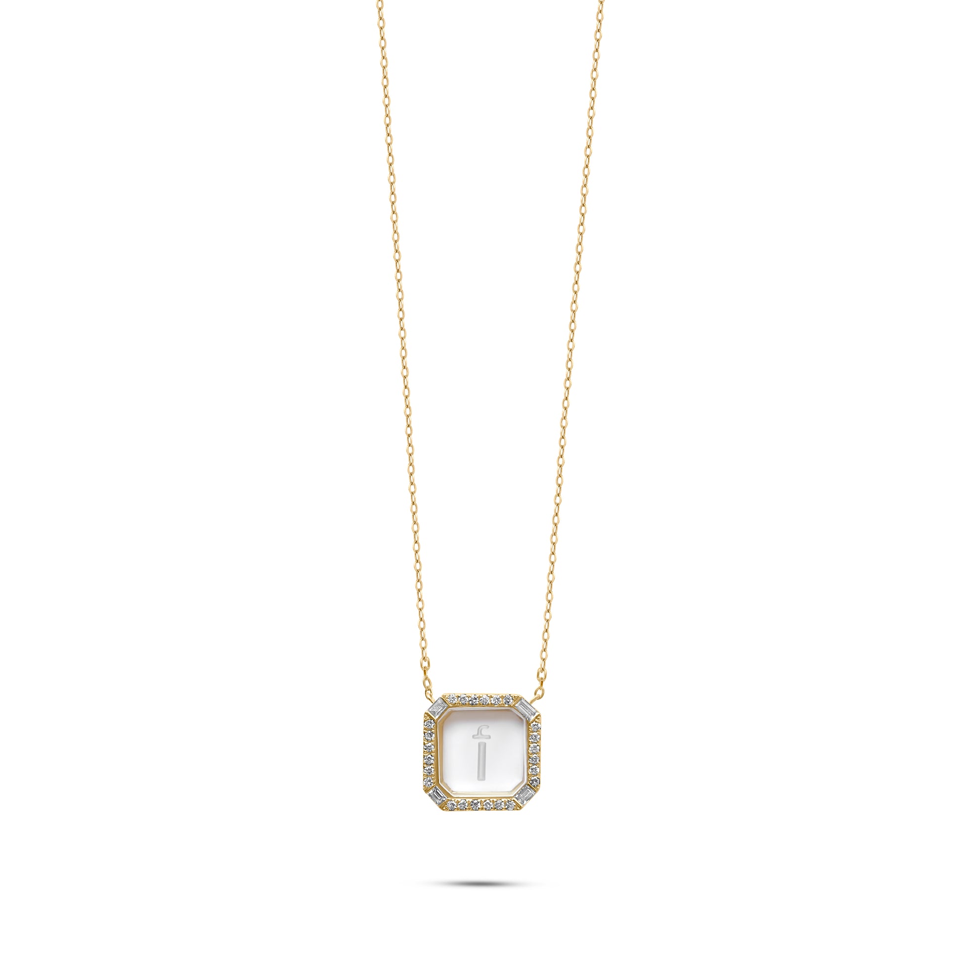 With an Arabic letter engraved upon the crystal quartz, Engraved Letter necklace is a 18k gold necklace rounded with decorative diamond details that empowers the self or symbolizes the beautiful bond of a loved one.