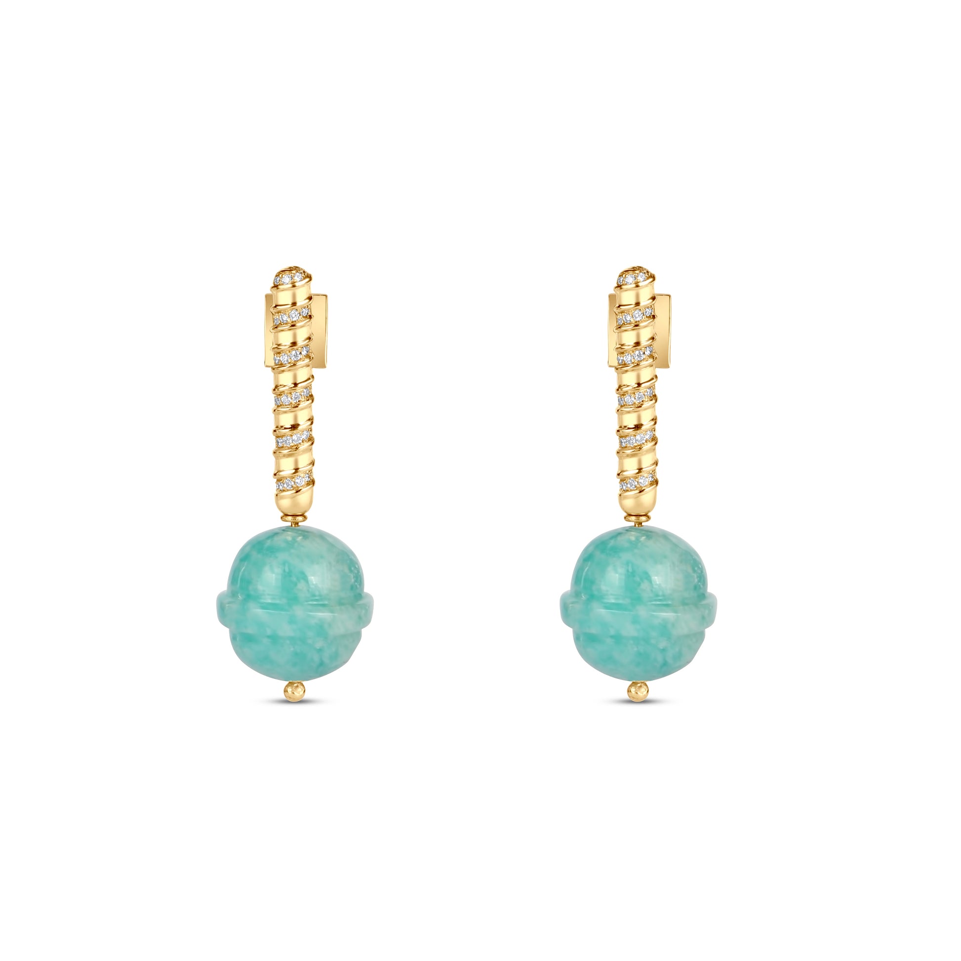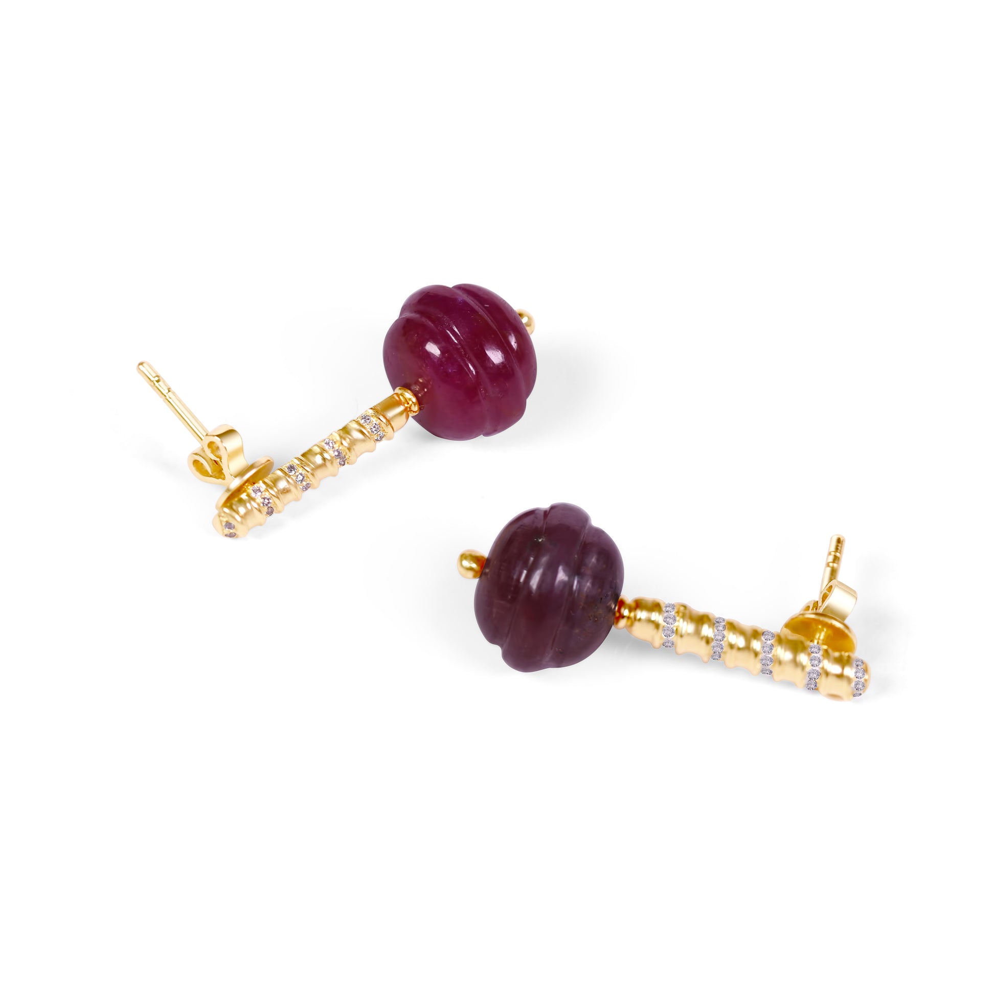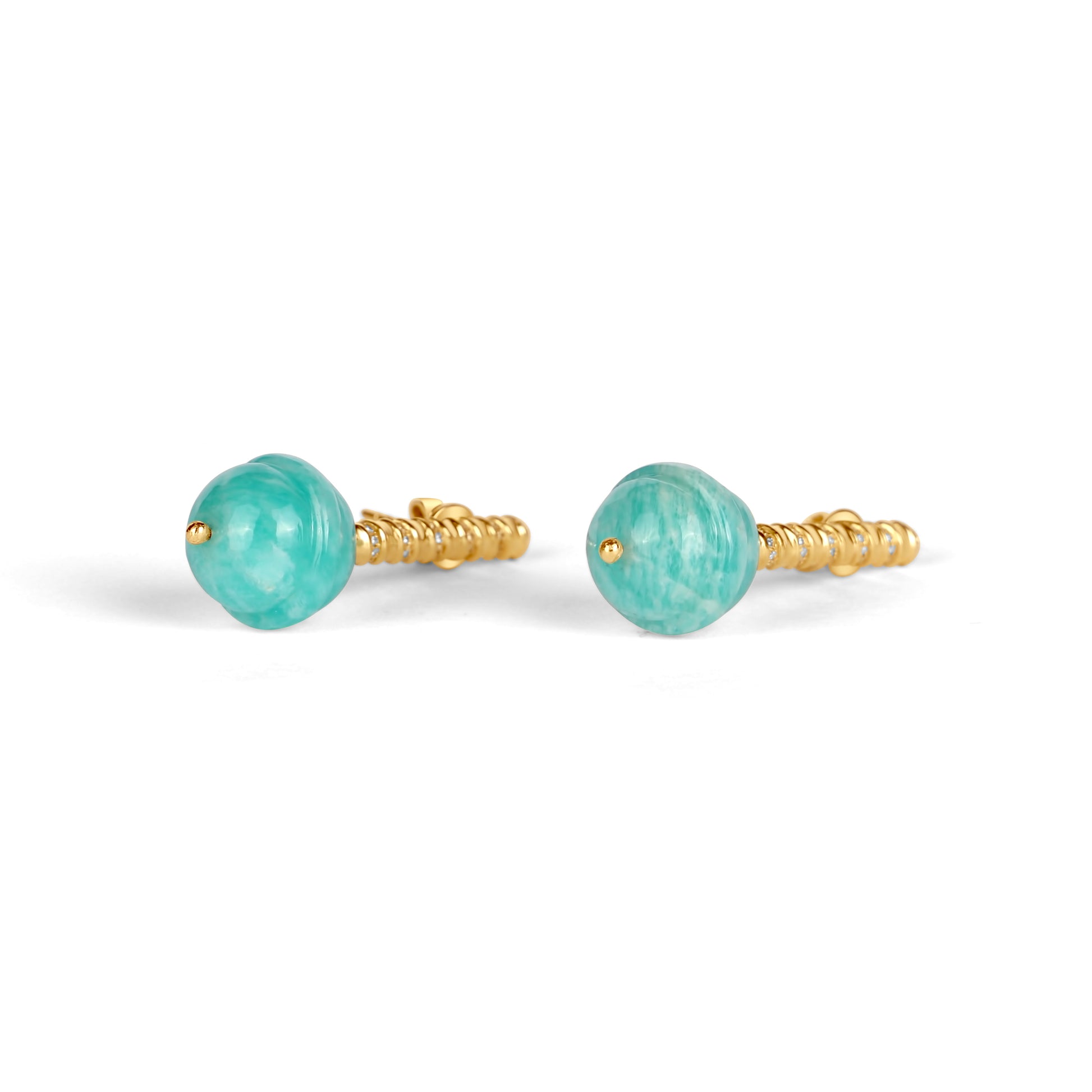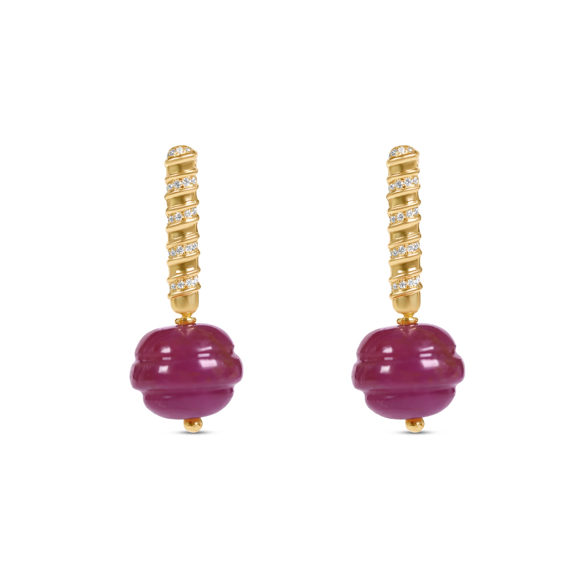 18k gold drop earrings with semi-precious or precious stones carved into small lollipops with diamond dangles.