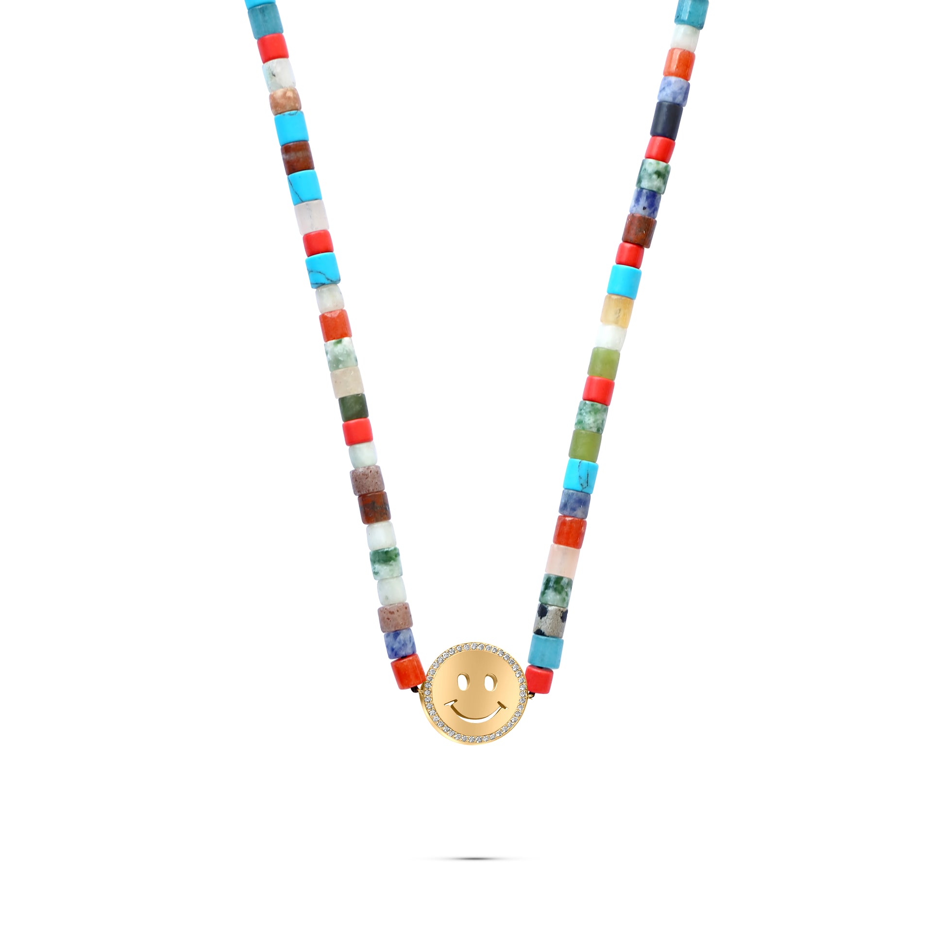 18k gold necklace with 15mm gold Smiley with colorful beads through a black thread.