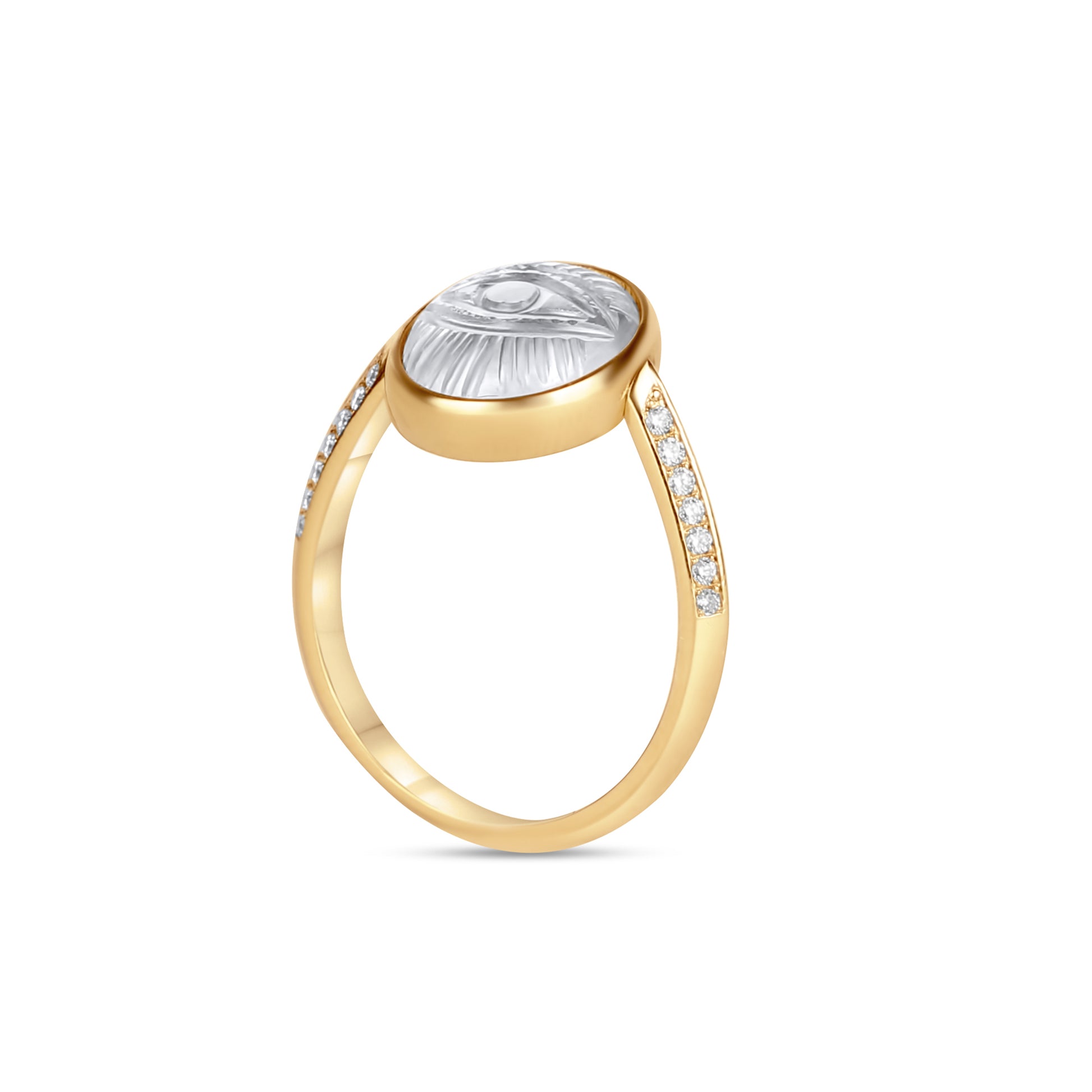 18k gold ring with engraved crystal quartz eye and diamonds on the side.