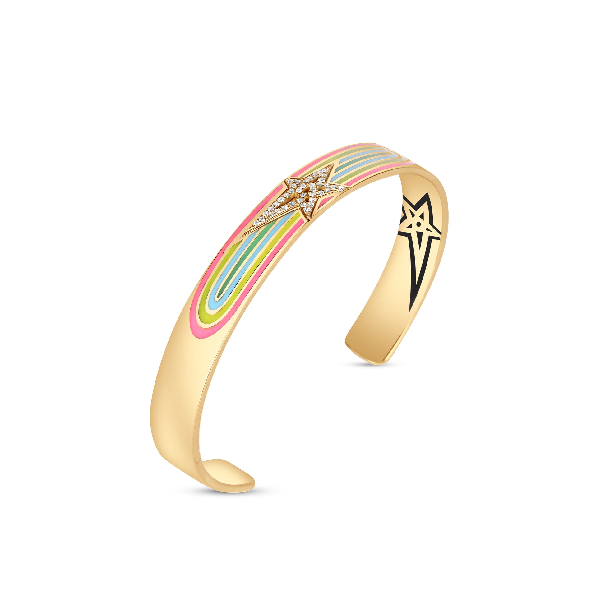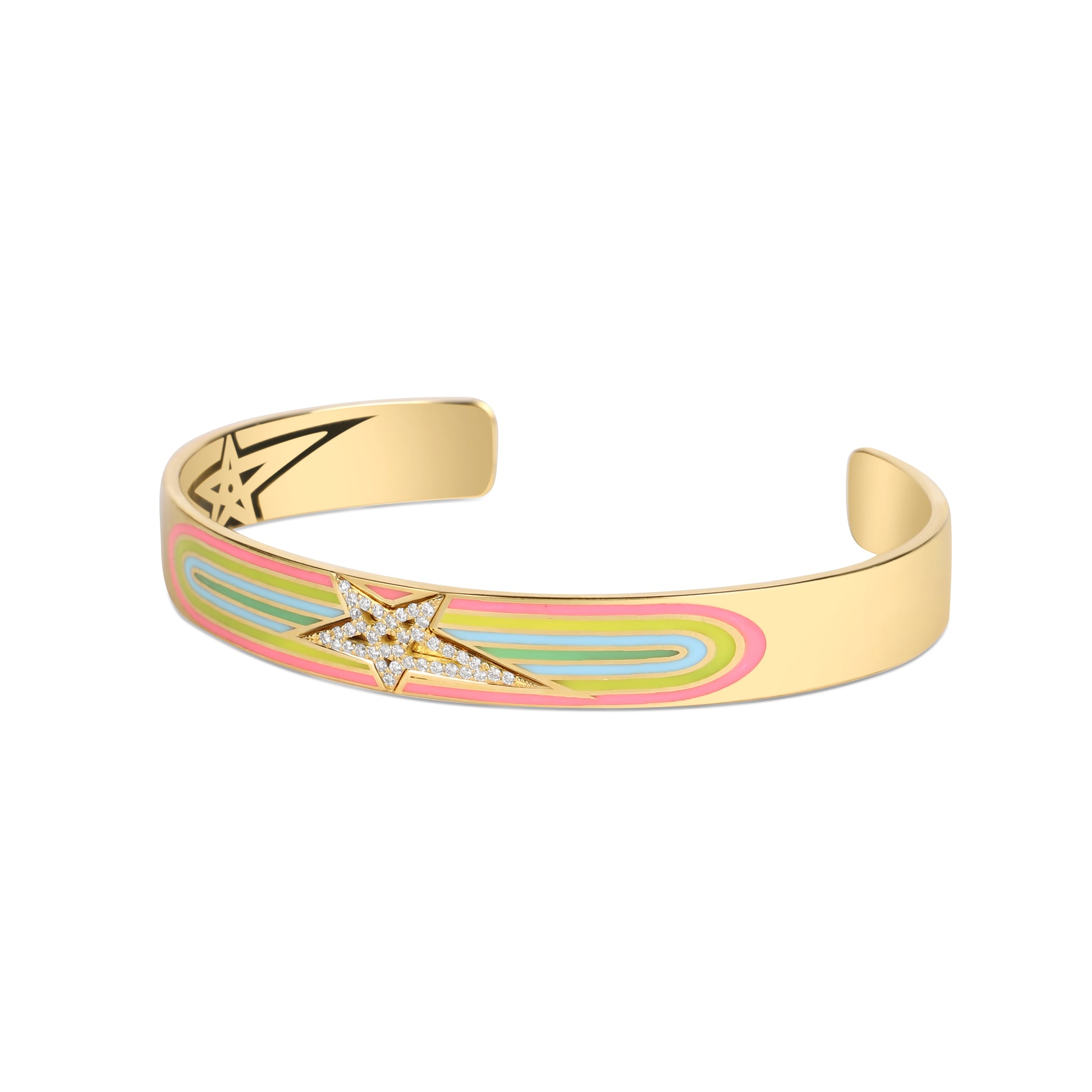 18k gold bracelet with a pop of colorful enamel and white diamonds shaped into a star.
